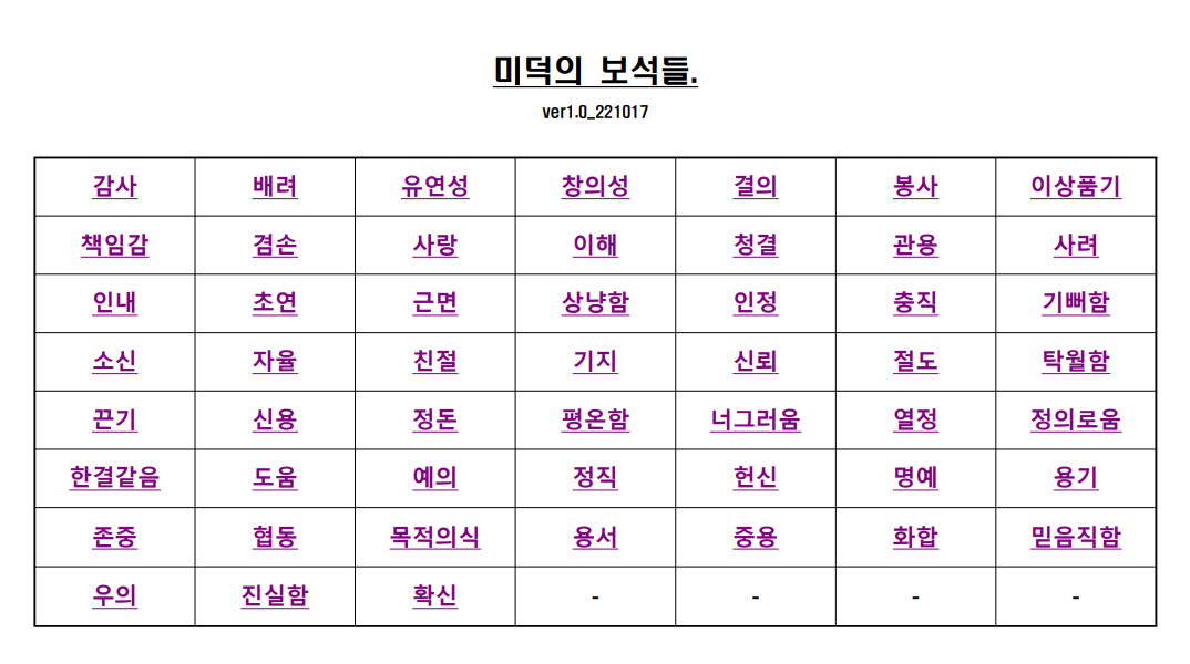 52가지 미덕은 버츄카드로 만들어져서 어떤 활동 행위를 규정하는데 예를 들면 감사, 배려, 겸손, 창의성, 결의, 책임감.... 이런 것들입니다.