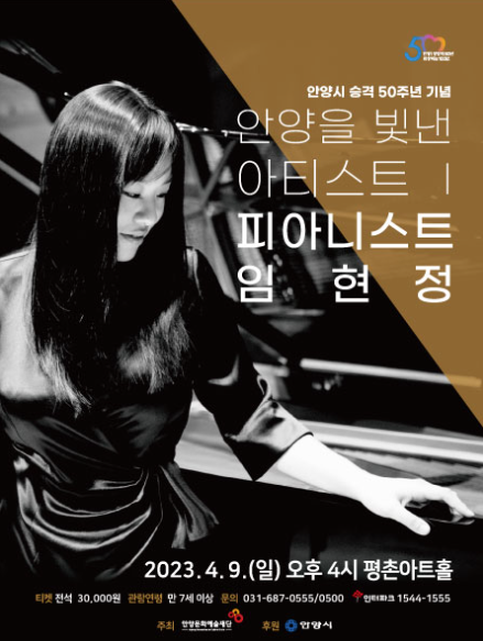 이번에 임현정 피아니스트의 공연은 2023년 4월 9일 일요일 "안양을 빛낸 아티스트"라는 타이틀로 안양의 평촌아트홀에서 16시에 열립니다.