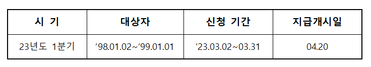2023년 1월 1일 기준으로 만 24세 청년에 한해 지난 분기의 미신청분 추가신청이 가능합니다.