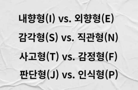 MBTI는 성격 유형을 내향형 vs. 외향형, 감각형 vs. 직관형, 사고형 vs. 감정형, 판단형 vs. 인식형으로 분류합니다.